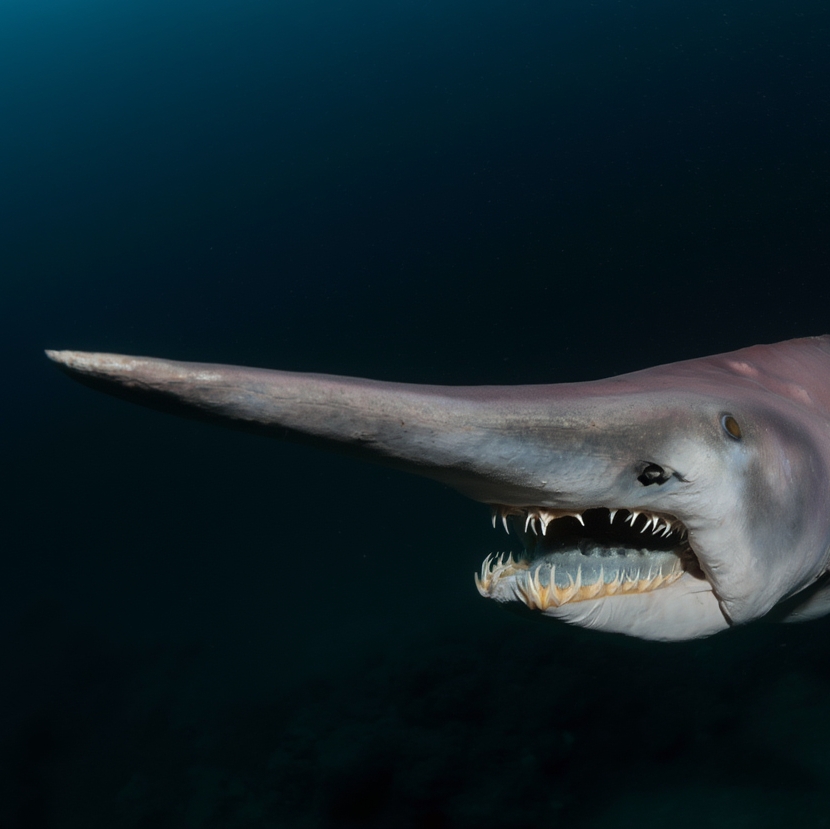 This rare shark has a long, flat snout and a jaw that can shoot forward to catch prey. It looks like something from a deep-sea nightmare.